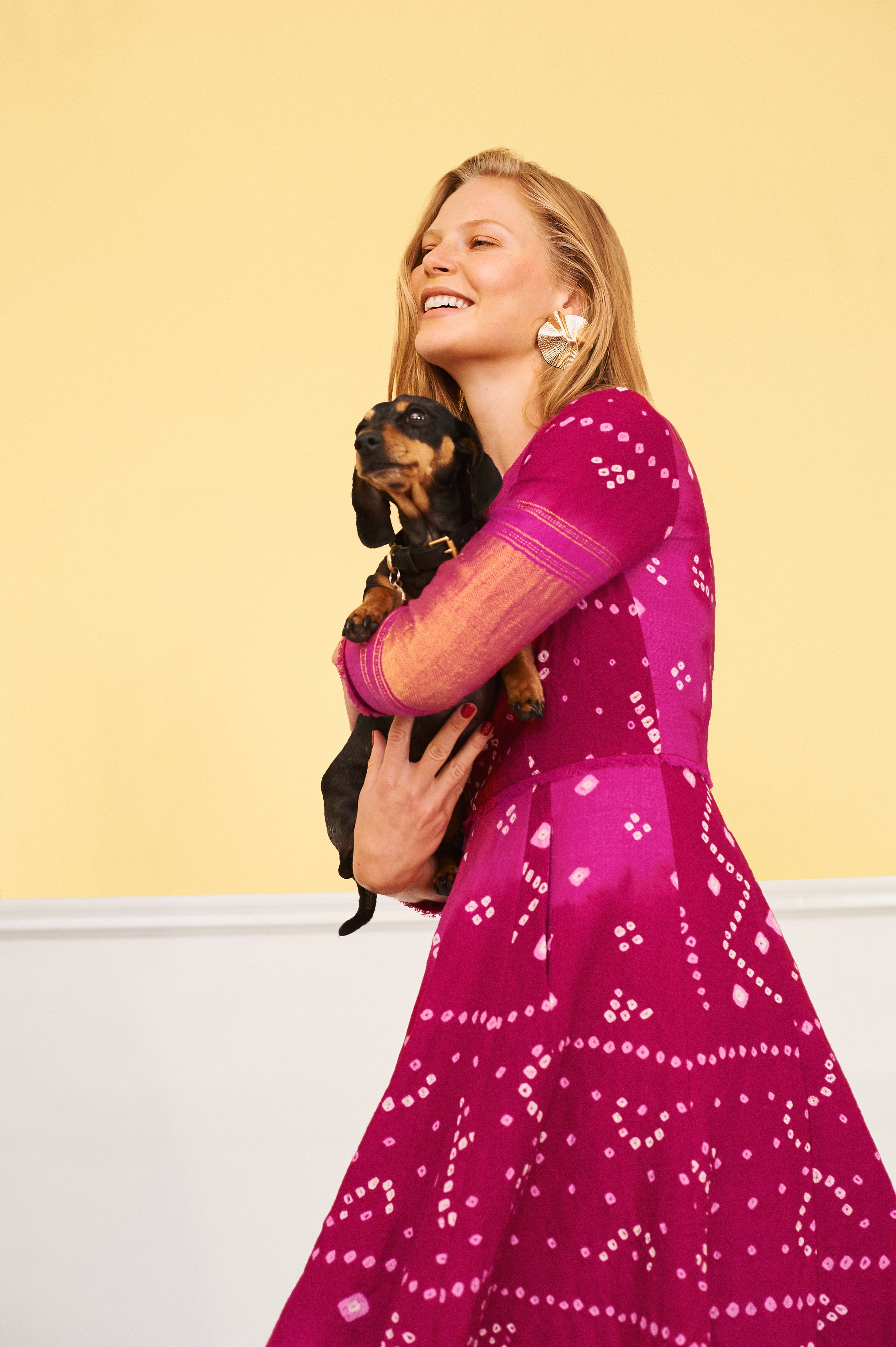 Parrot’s rich raspberry hue comes alive in an elegant fit-and-flare silhouette. Crafted using Kutchi handwoven textiles with a soft golden shimmer on the sleeves and arms, it is finished with playful frayed edge detailing.