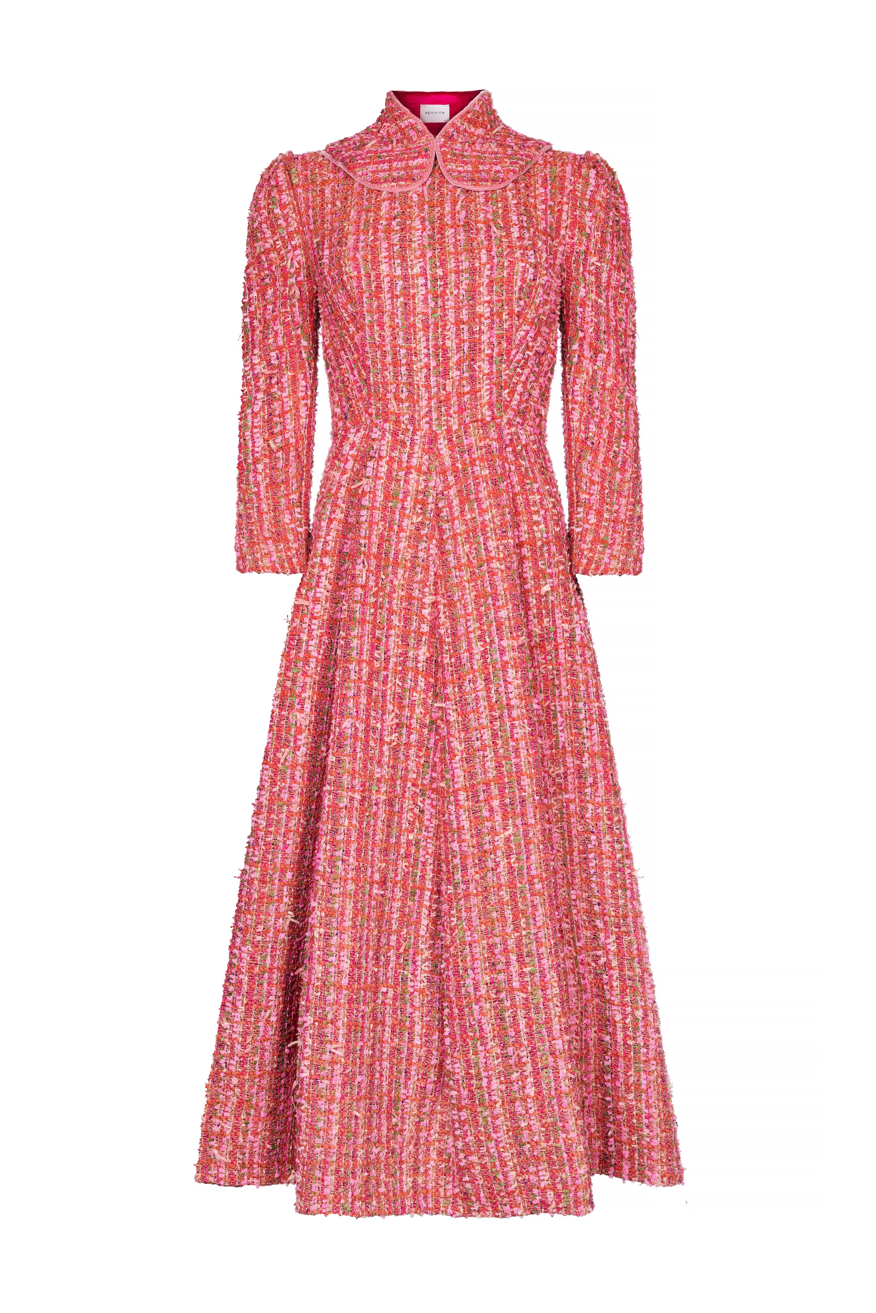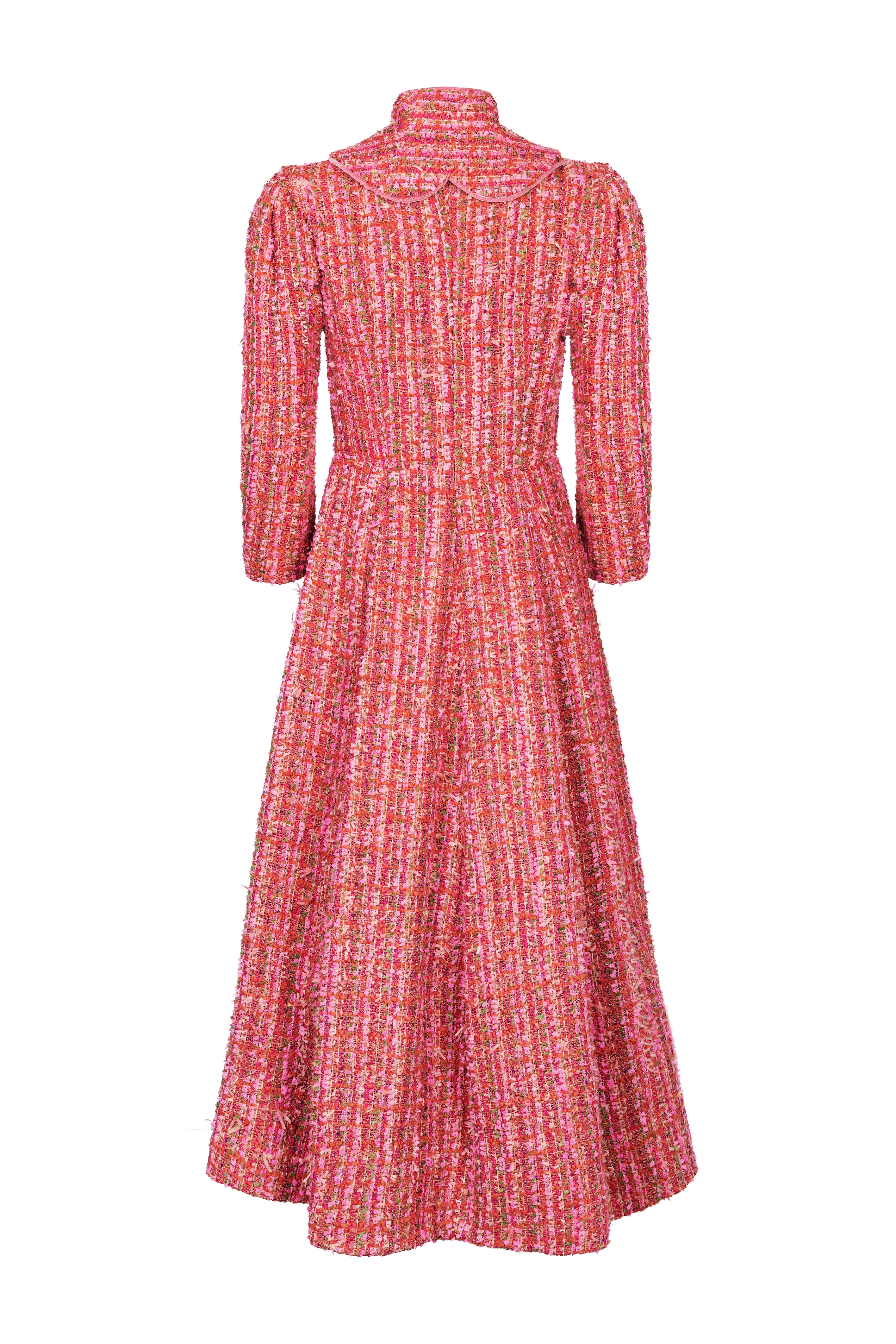 The Cinderella midi dress is crafted from a textured boucle imagined in shades of red and pink, beautifully contrasted by a refreshing pop of green. Puff sleeves and a pleated skirt create feminine structure, whilst the detachable high-neck collar, adorned with playful scalloped detailing and tonal velvet piping, provides an elegant, refined finish. Cinderella is lined in soft silk satin.