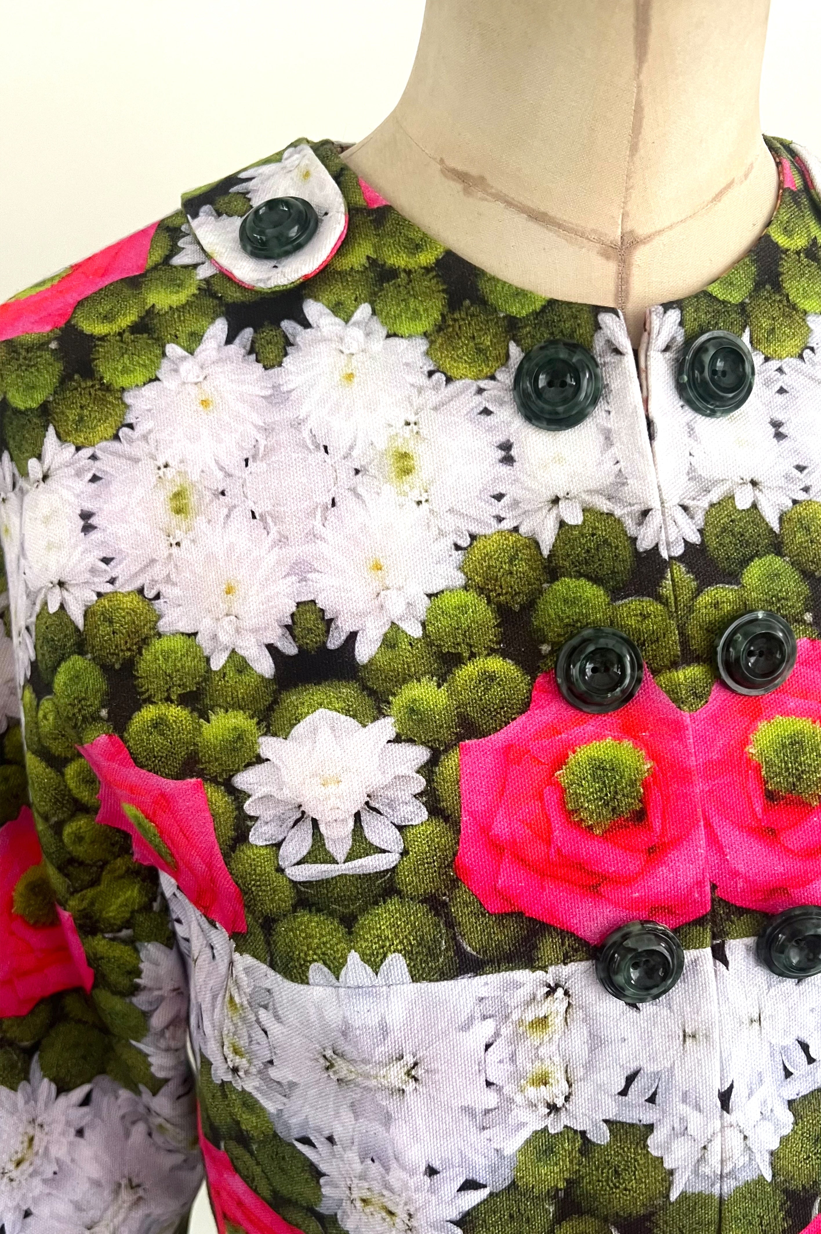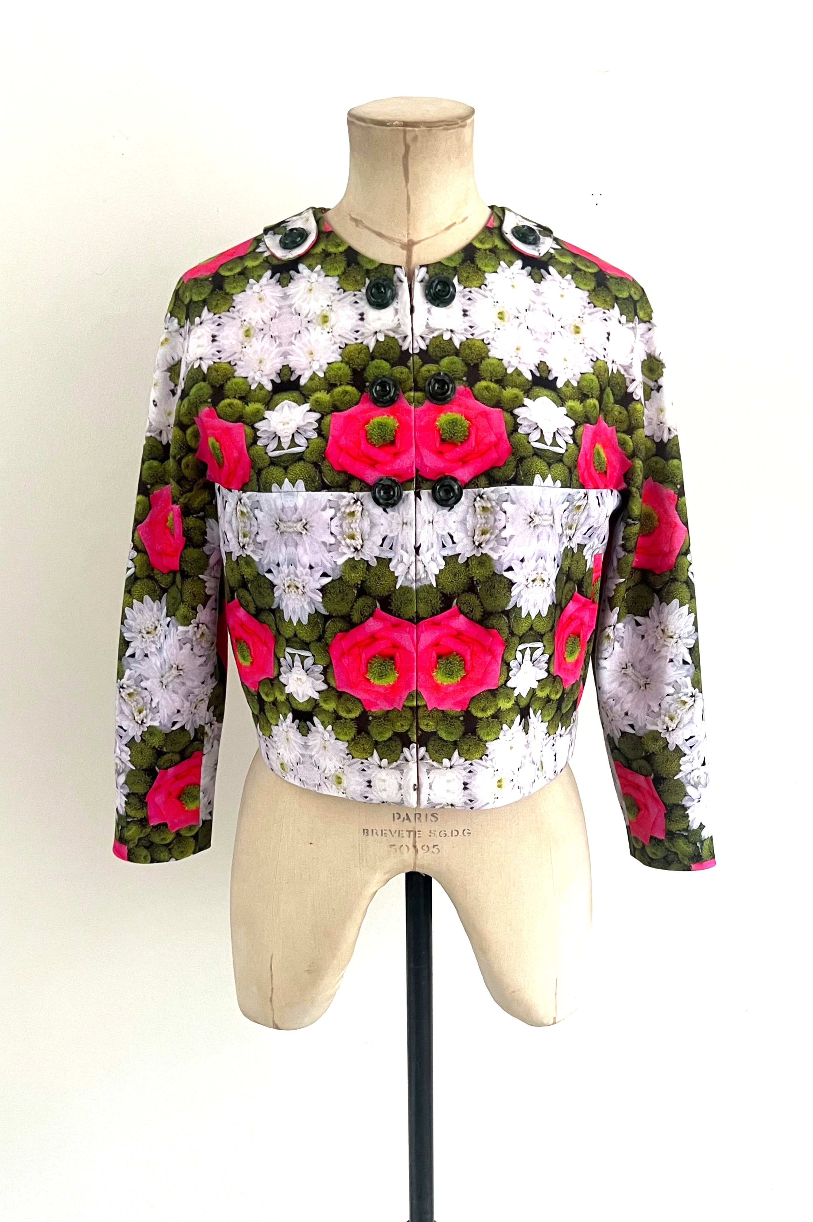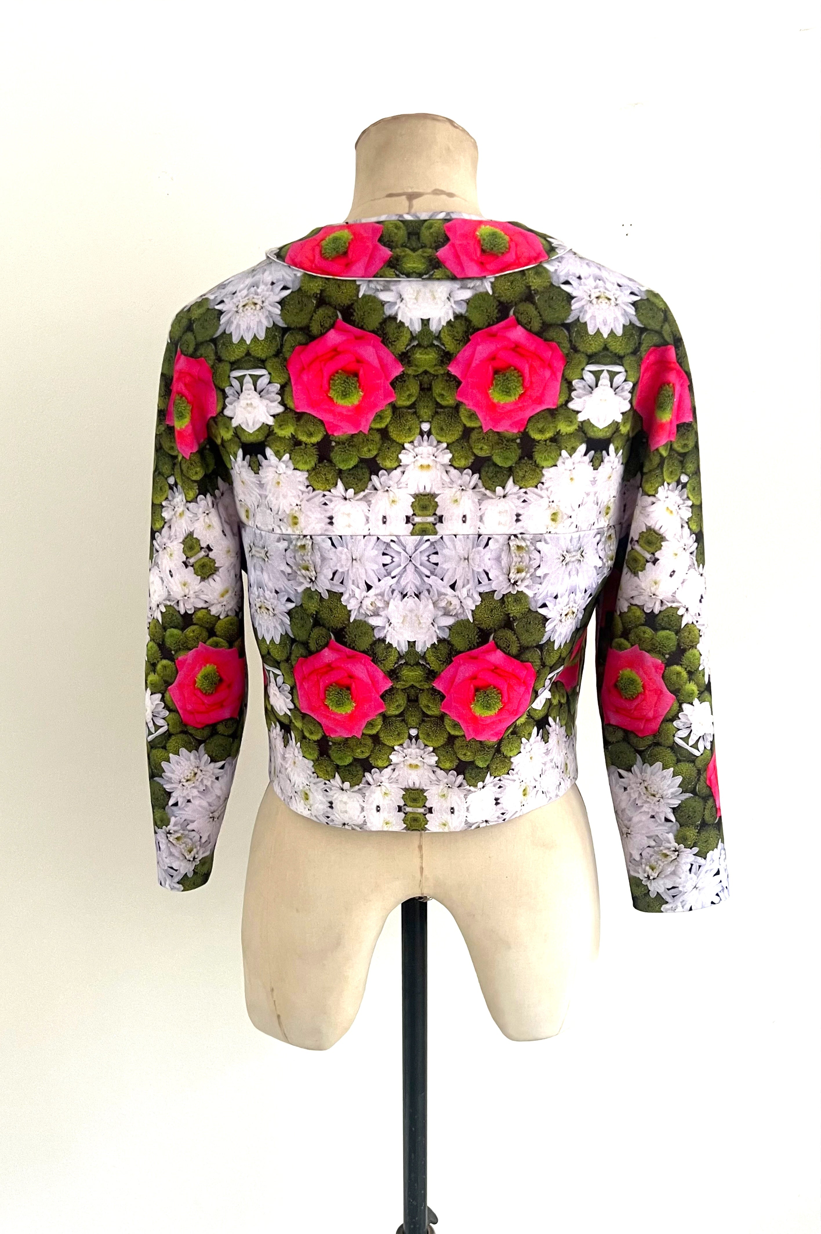 The Pandora jacket is crafted from the limited edition Eponine x Pam Weinstock printed cotton. Featuring a cropped silhouette, full length sleeves and a round neck. Tonal buttons decorate the centre-front and the collar, adding a playful touch. Pandora is lined in silk satin.