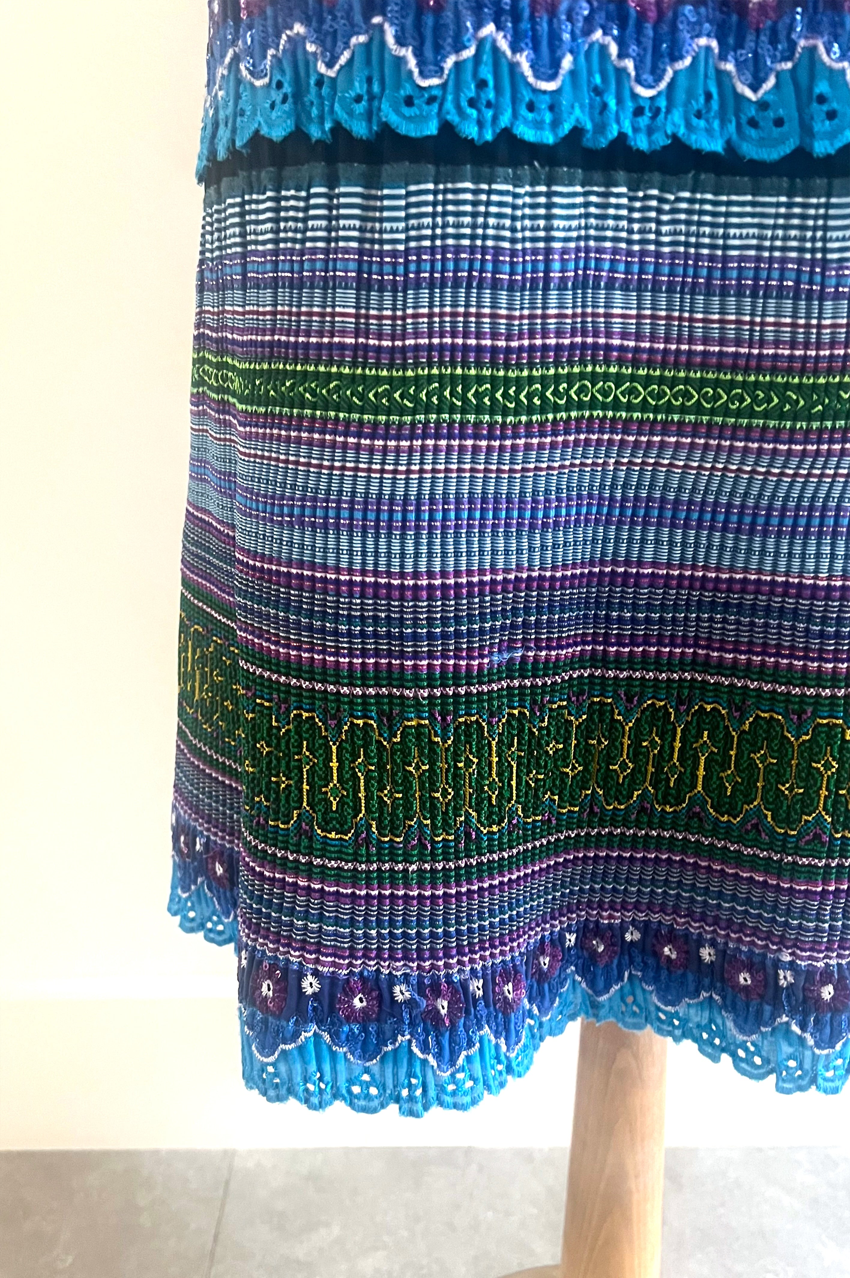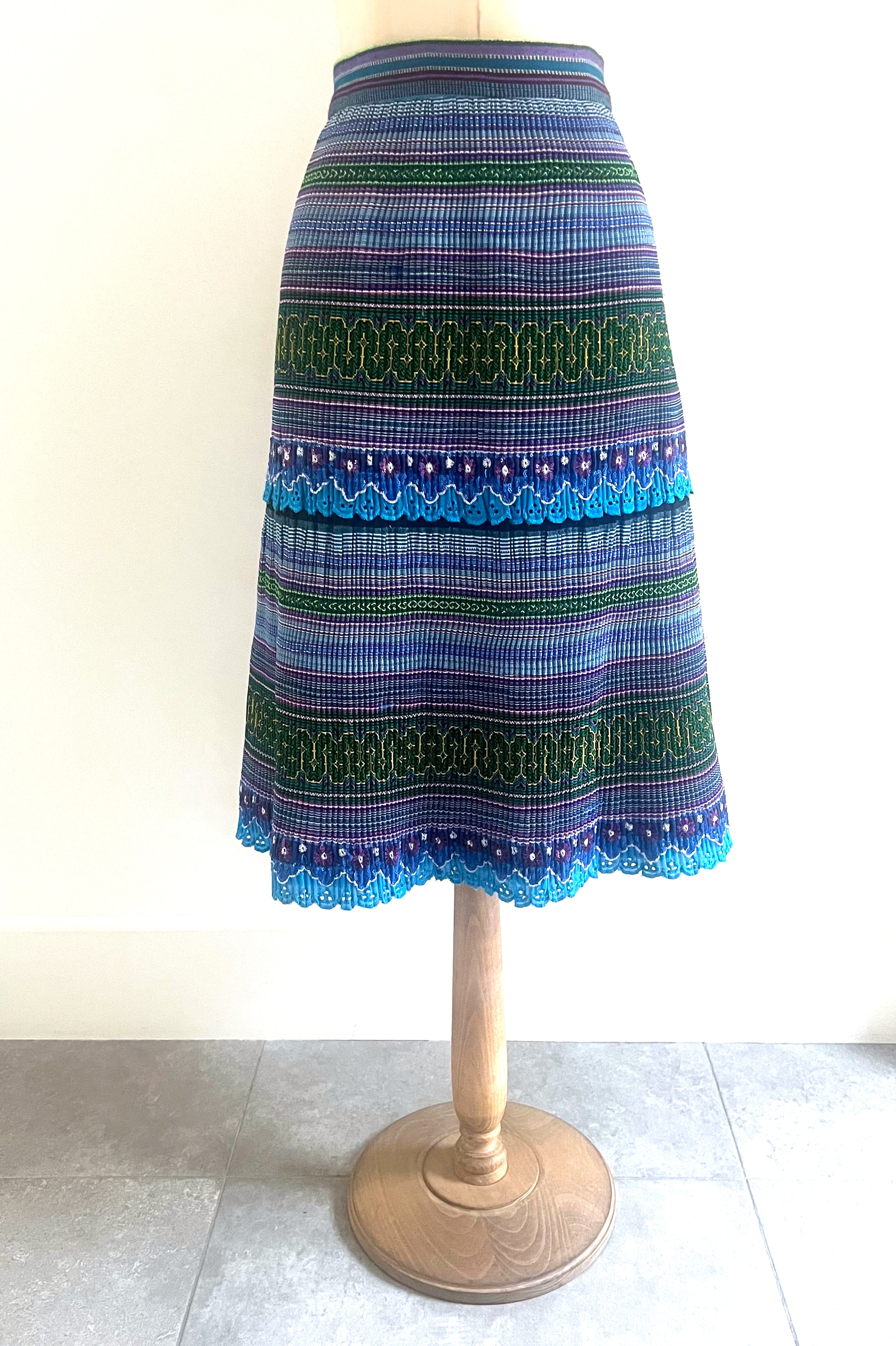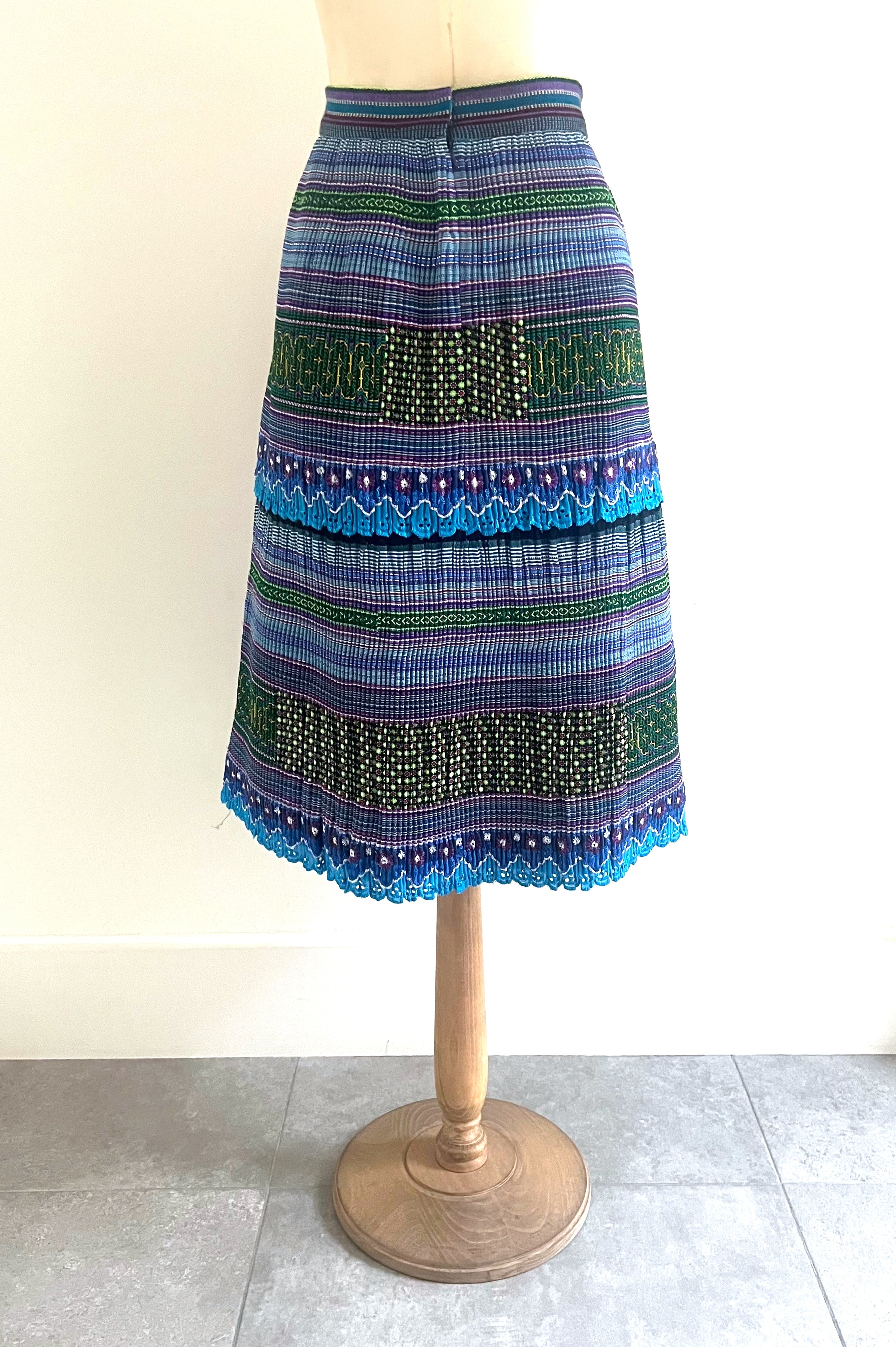 The Magic Flute skirt is artfully crafted from strips of vintage pleated Hmong textiles meticulously pieced together; some featuring exquisite hand-embroidery. The Magic Flute sits below the knee with an A-line silhouette and a hidden zip fastening on the centre-back.