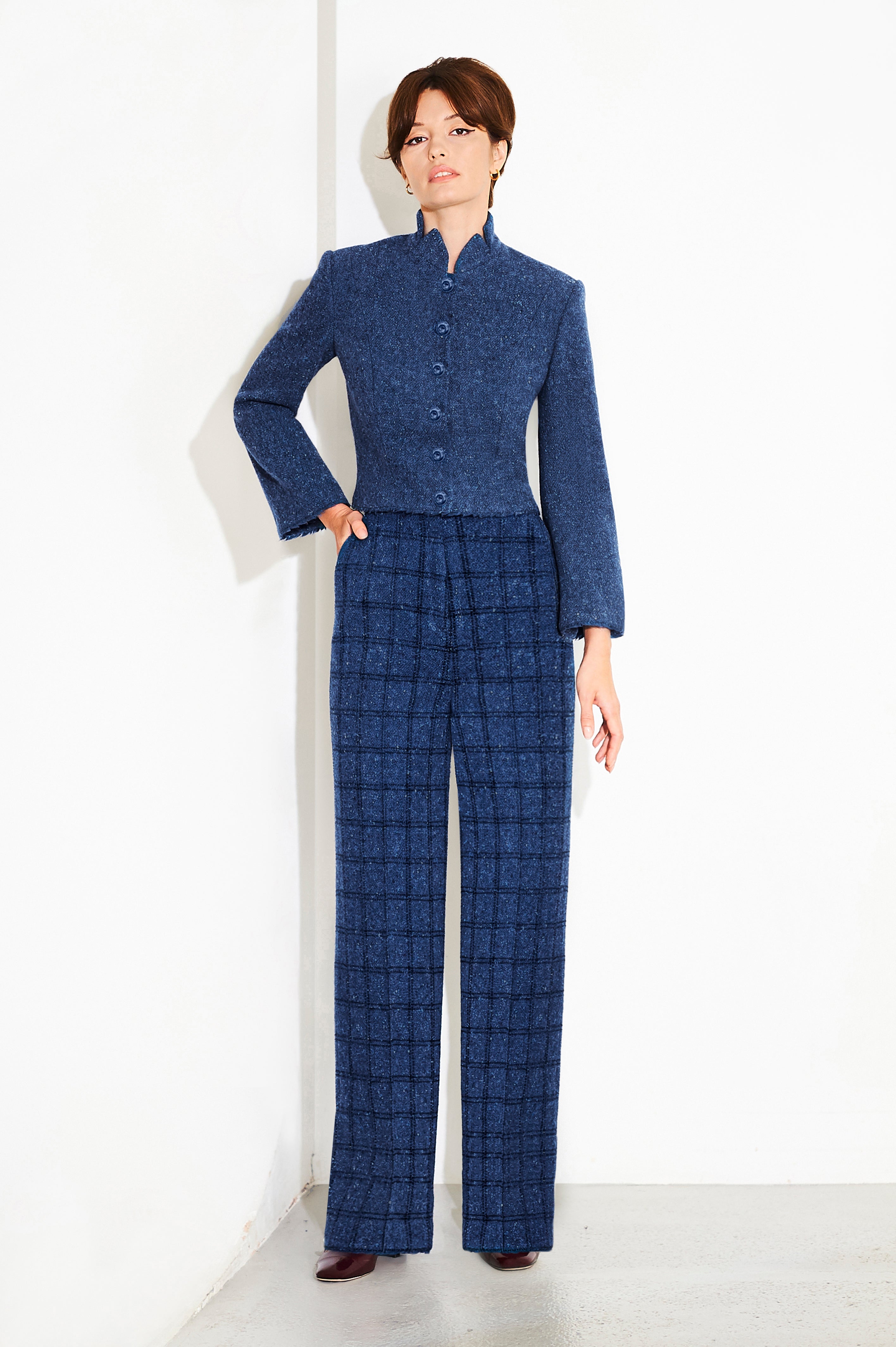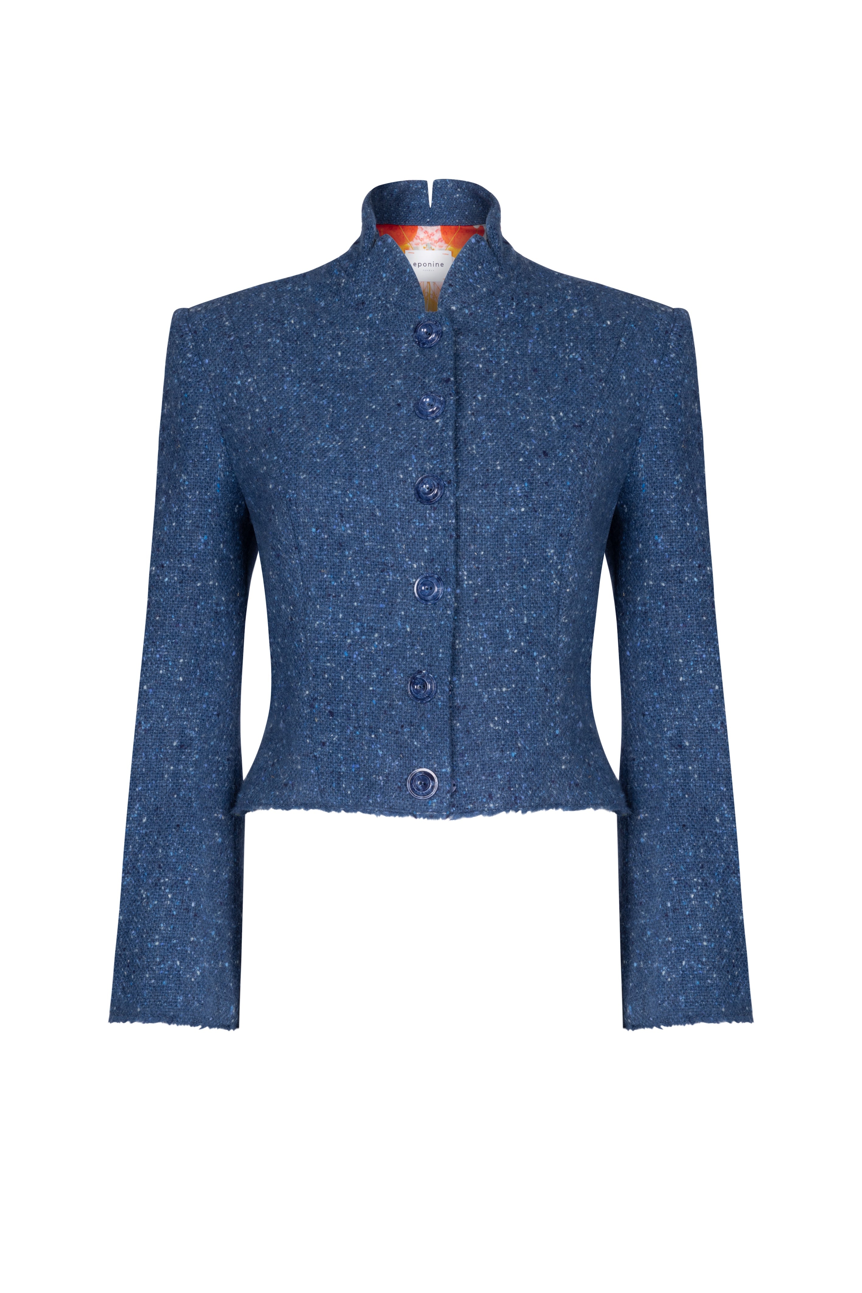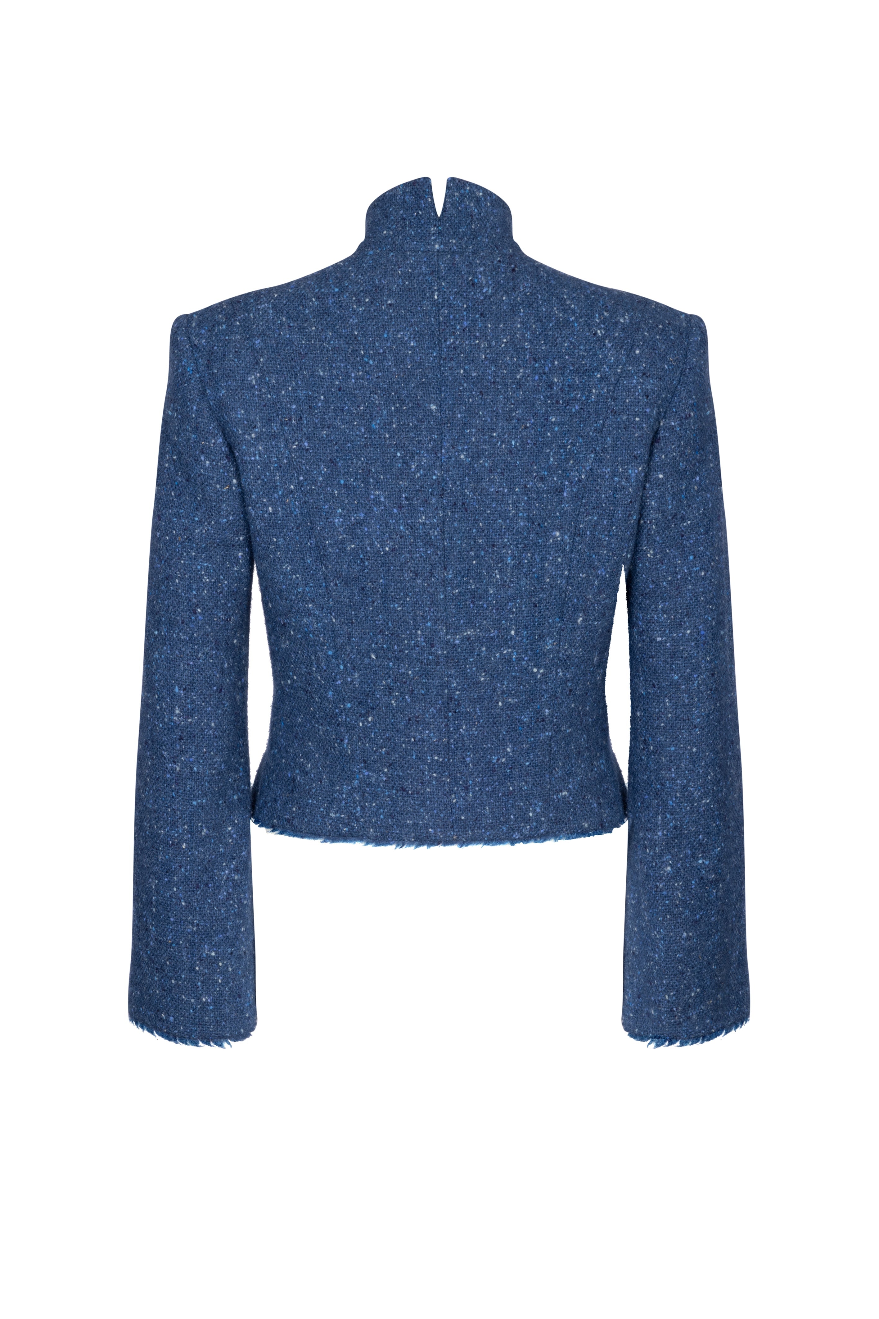The Nutcracker jacket features a fitted, cropped silhouette, elegant full length fluted sleeves and a playful cut-out neckline. Tonal button fastenings on the centre-front and frayed edges add textural details, while a silk satin lining sits ever so gently on the body. Pair to perfection with the Giselle trousers.