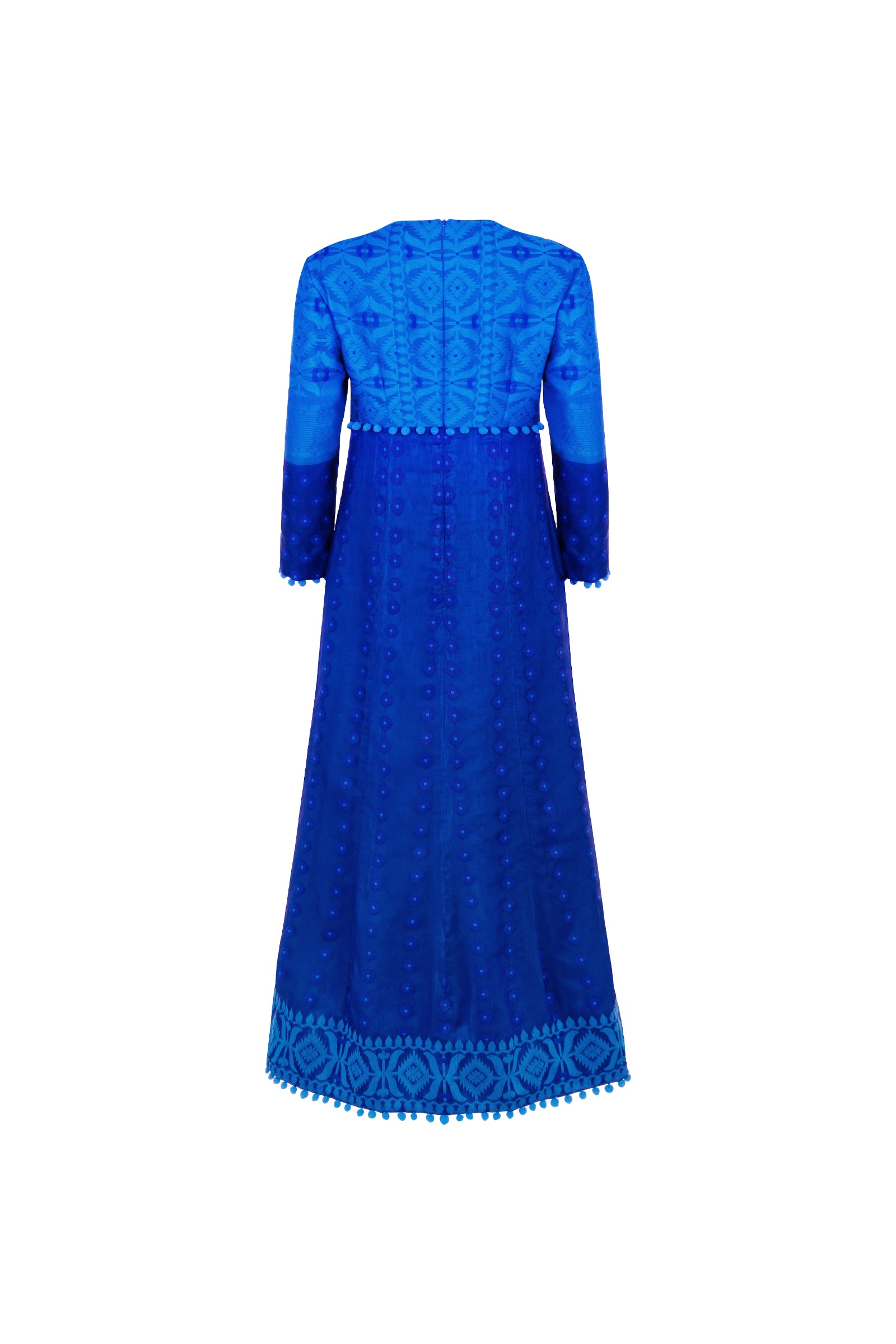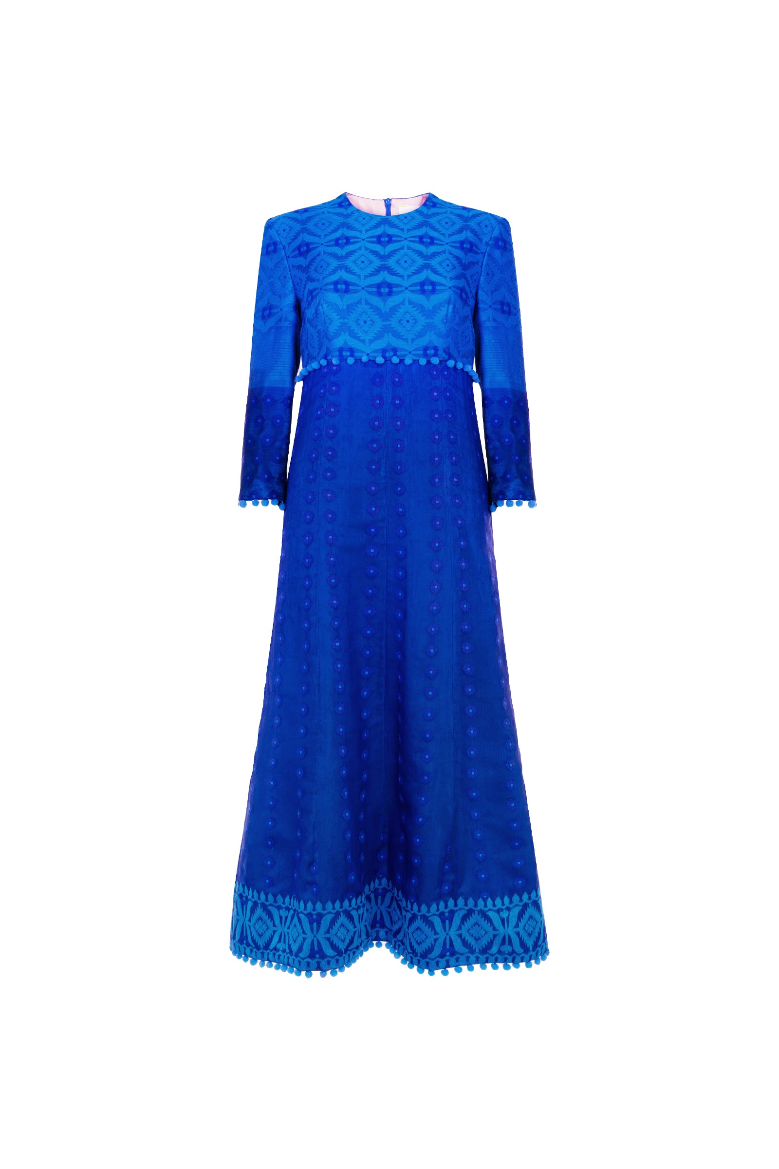 Cut from a Silk saree, the midi Lolly dress features three-quarter length sleeves, hidden pockets on either side seam and a zip fastening on the centre back. An empire line offers a beautifully flattering, straight silhouette that flares ever so slightly at the hem.