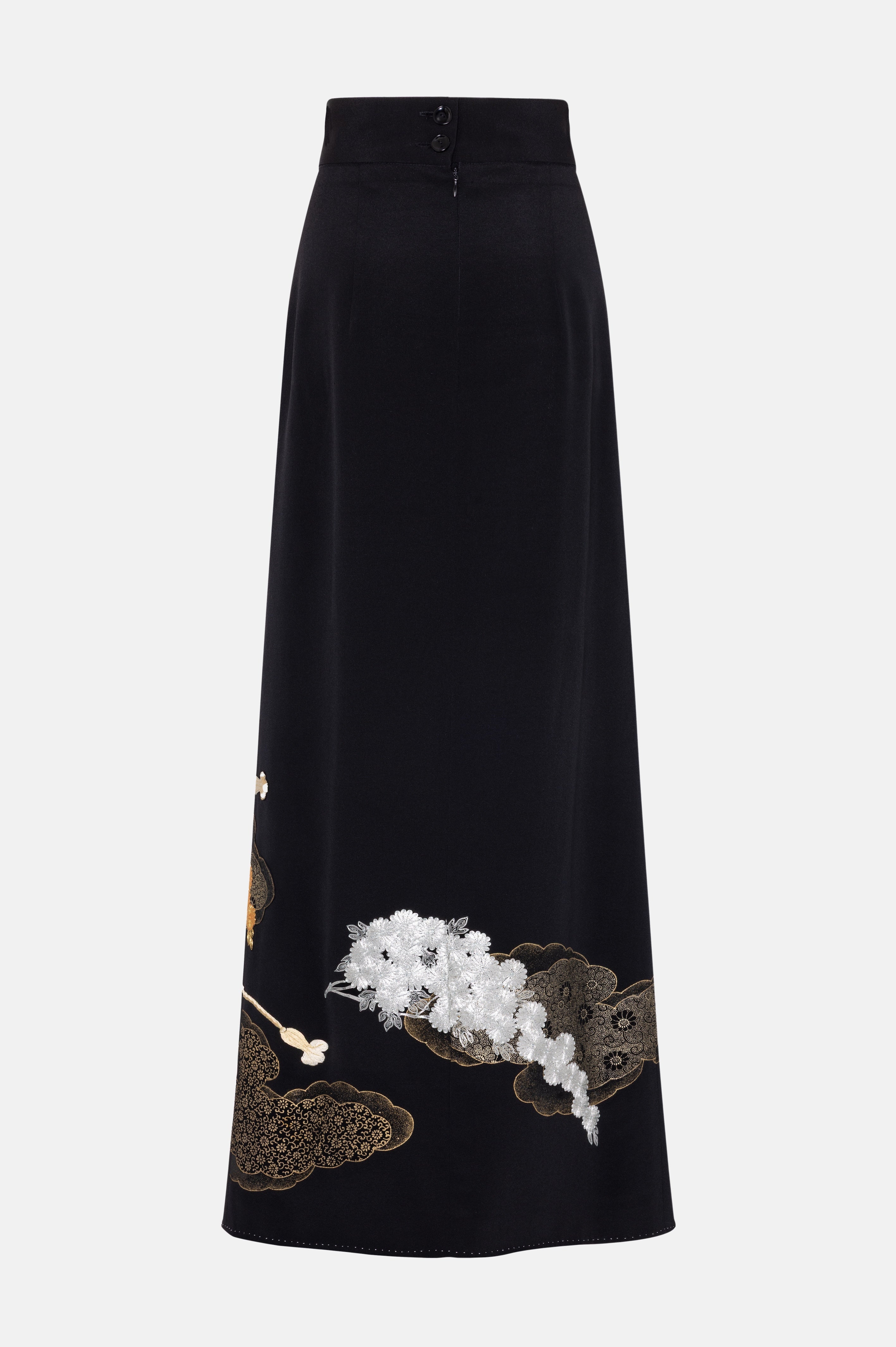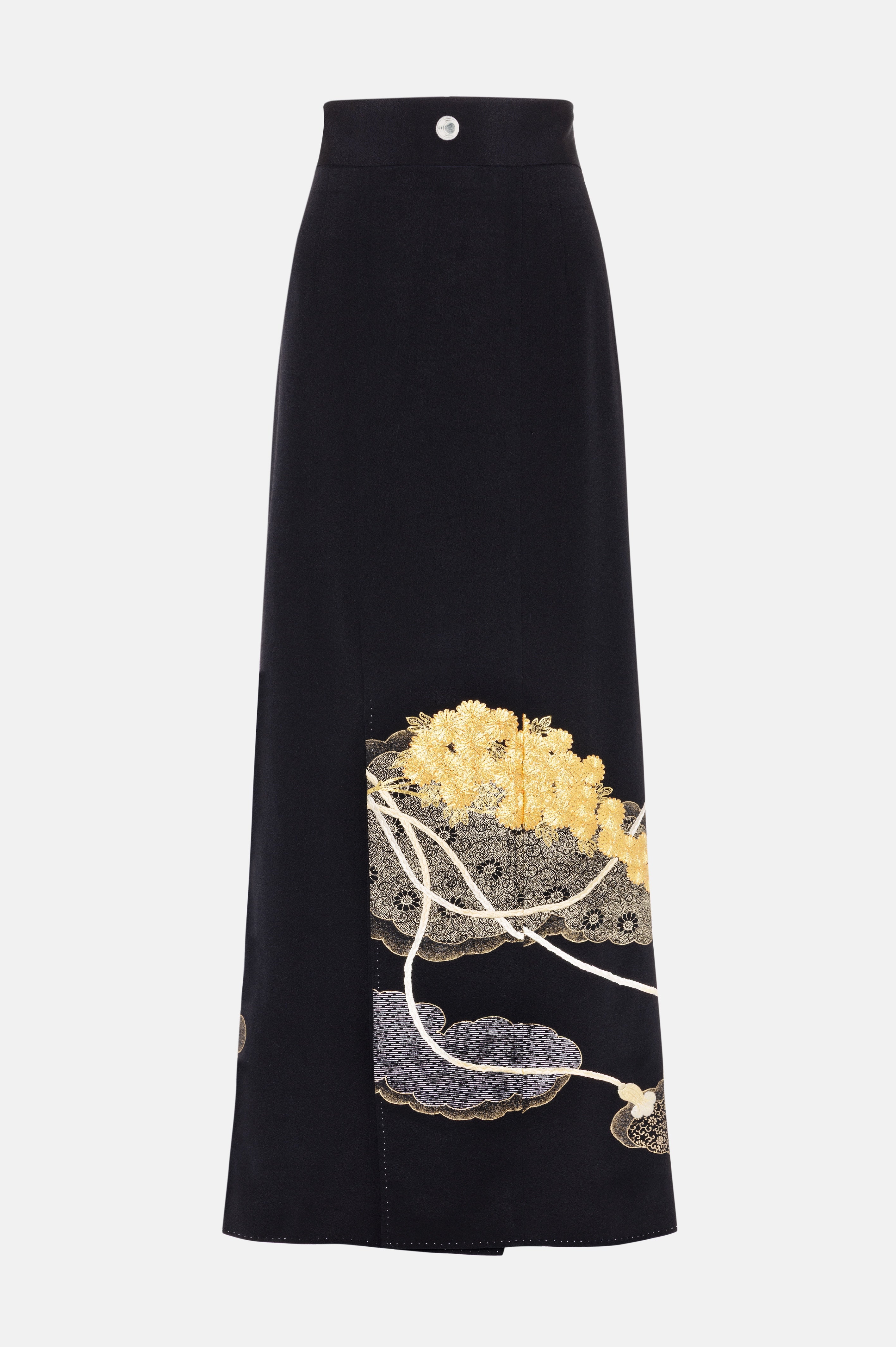 Repurposing exquisite textiles is a technique for which Eponine is synonymous, exemplified here in the Crane skirt. Cut from a vintage silk Japanese kimono featuring intricate gold leaf detail and hand embroidery, Crane masterfully combines the old and the new; culminating in an elegant and unique design. For an exquisite monochrome look, pair with the Duck jacket.